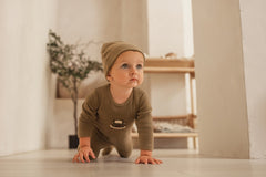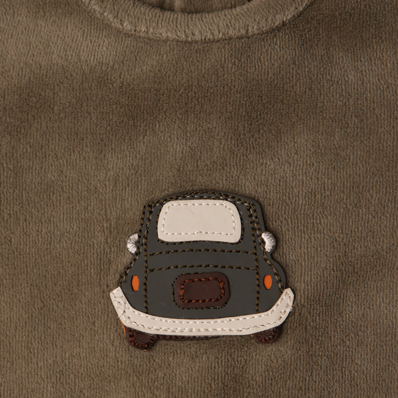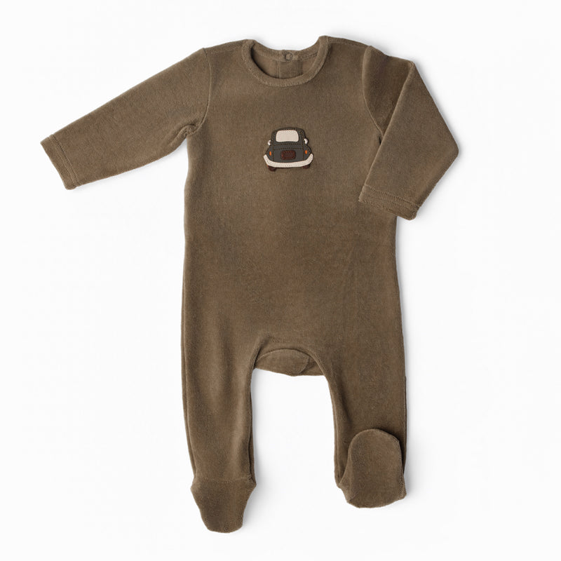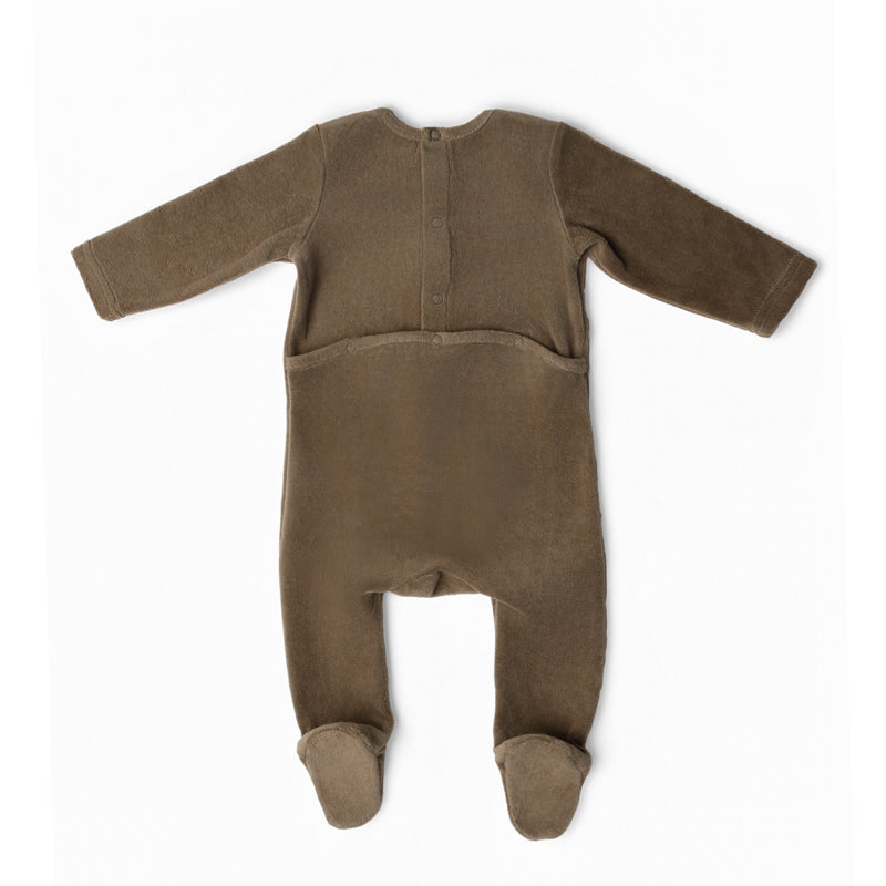 Soft velour one-piece pajama, perfect for winter in earthy tones offers a soft, plush comfort and natural style for baby.