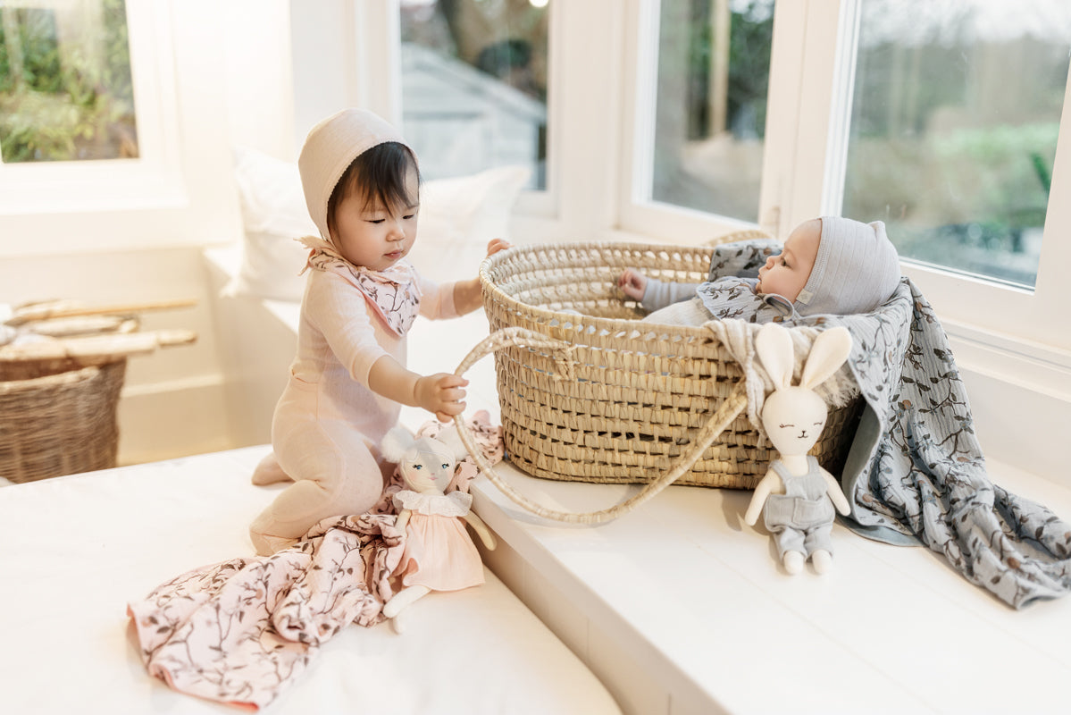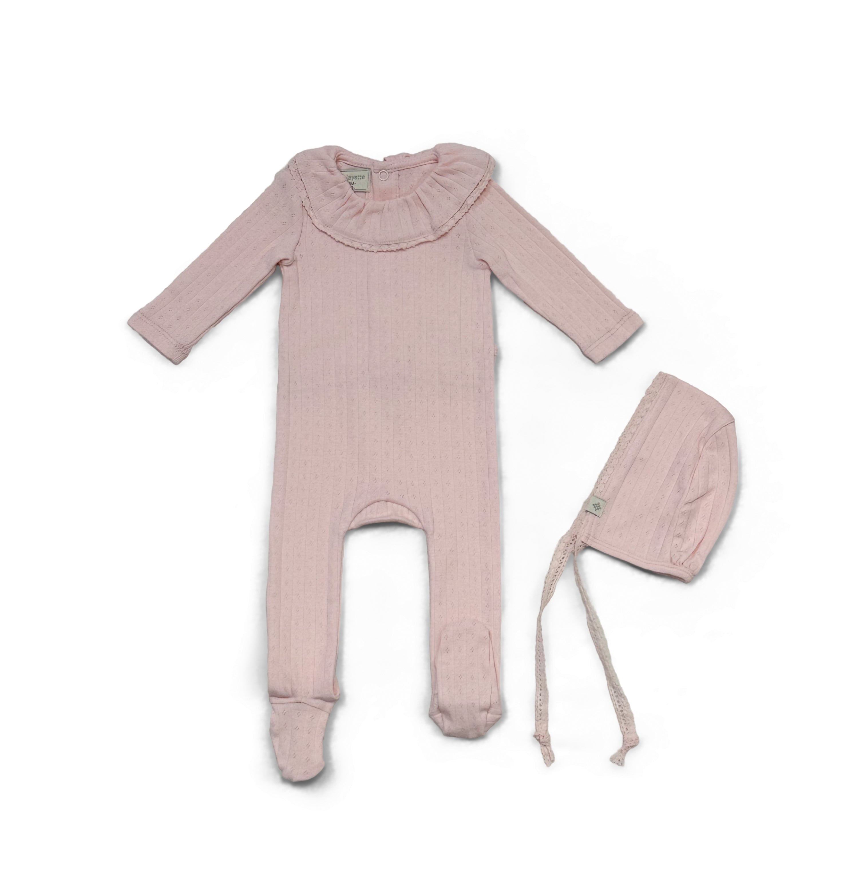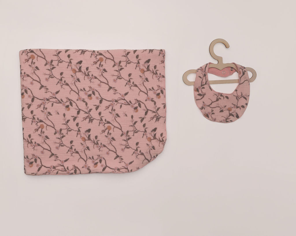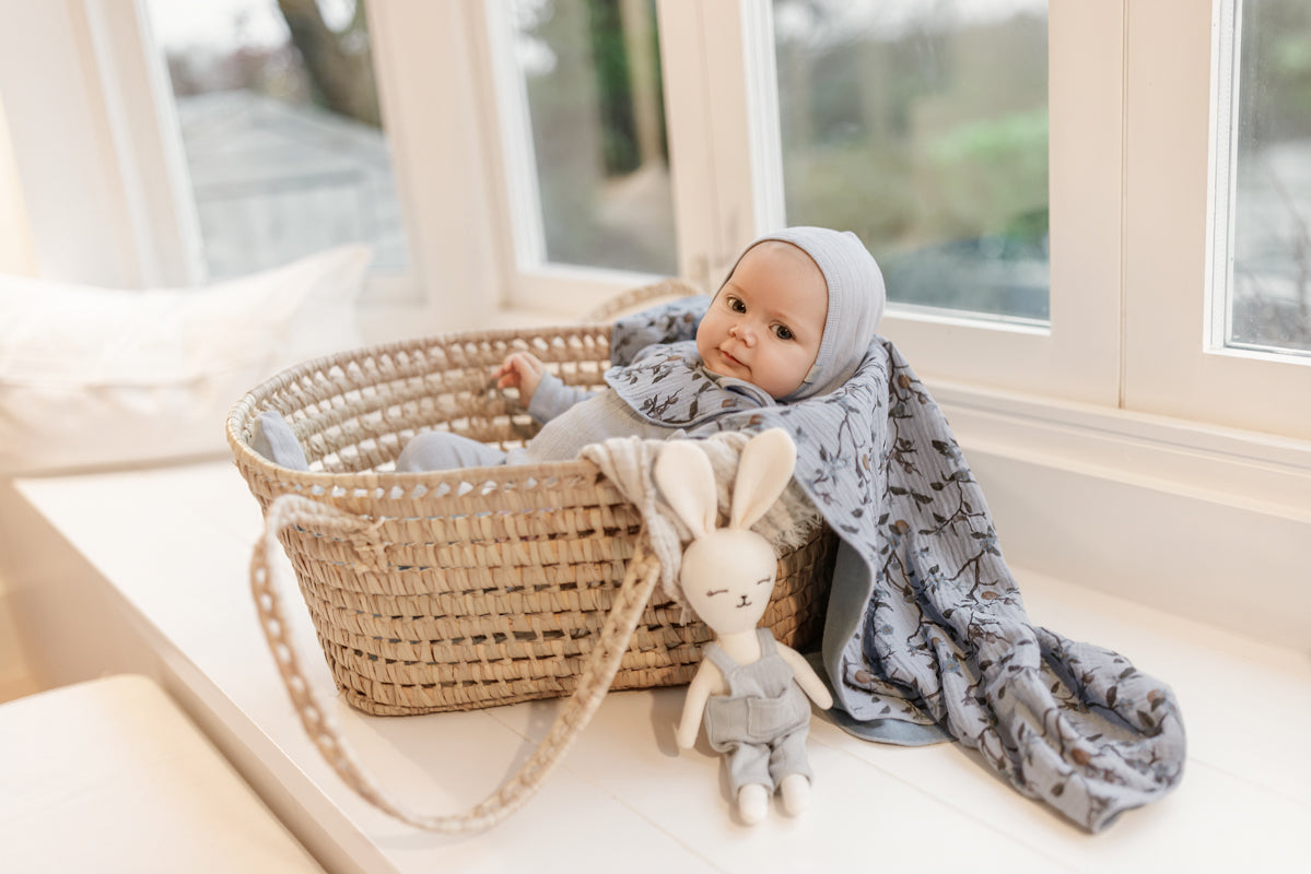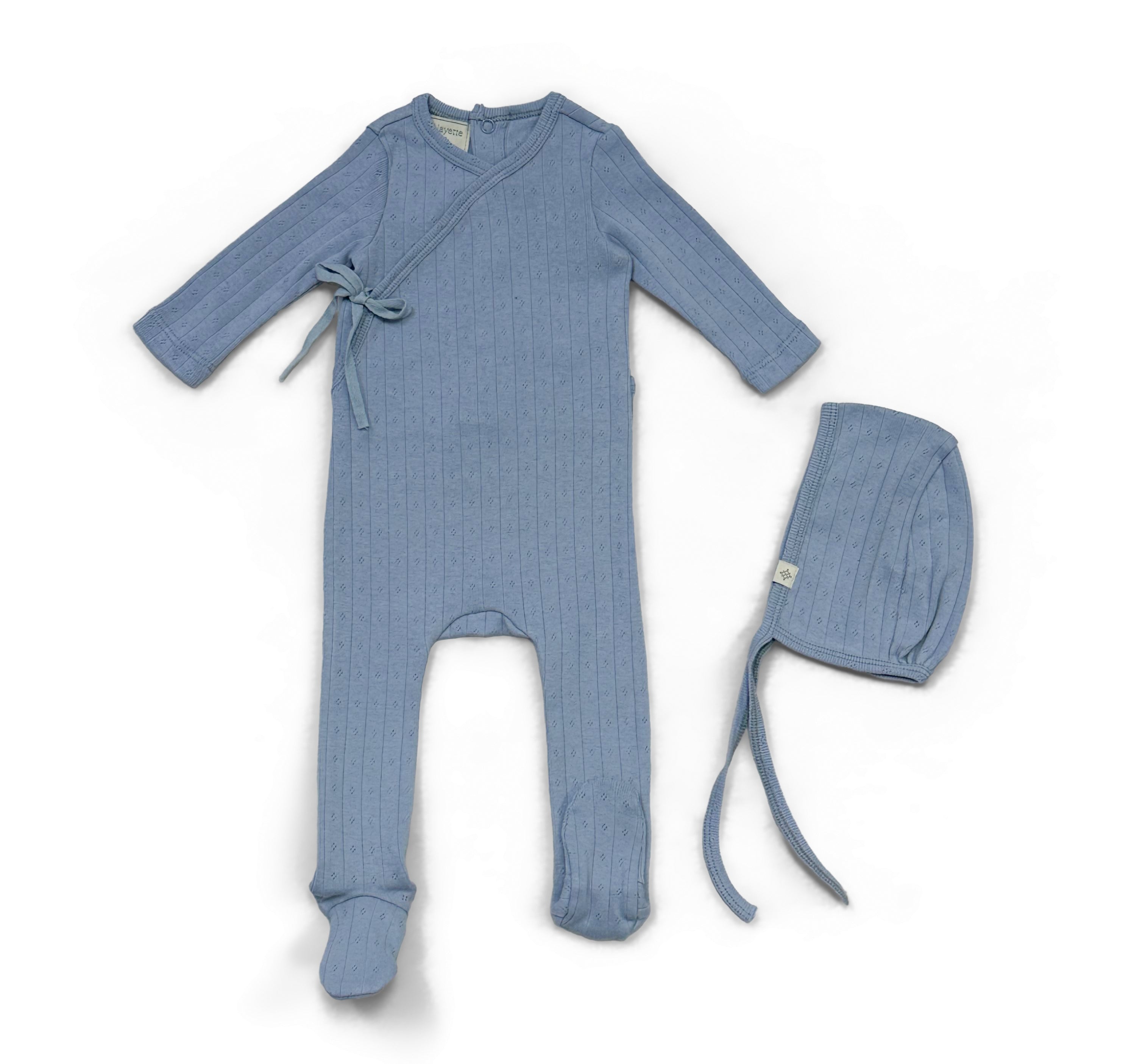 soft cotton onesie, complete with a cute Bib hat and a matching printed blanket. Available in two charming colors.