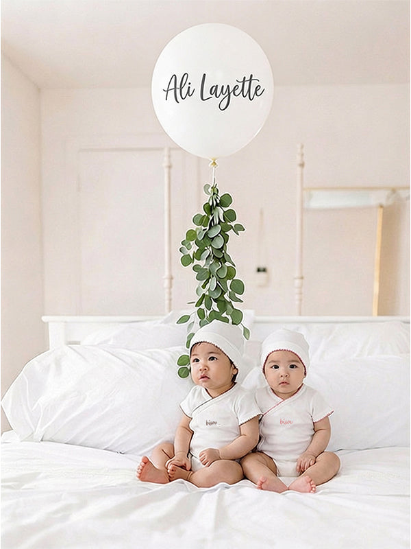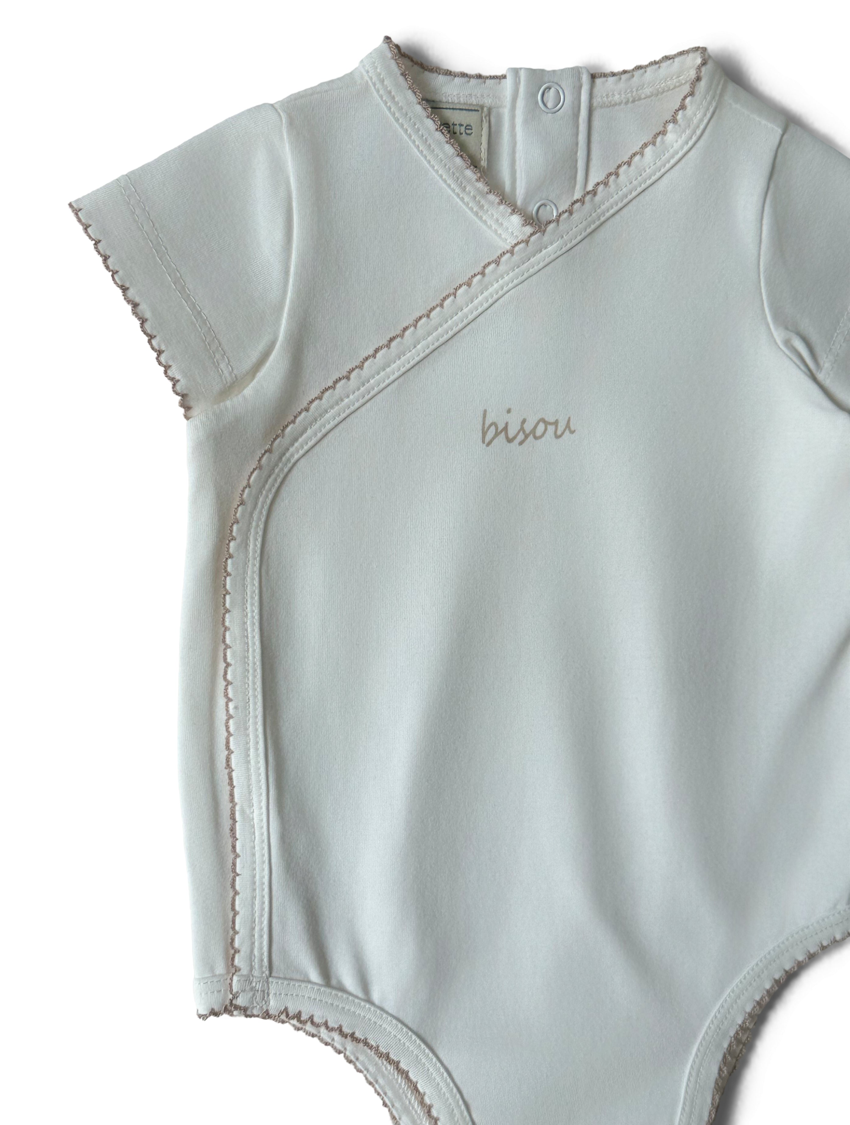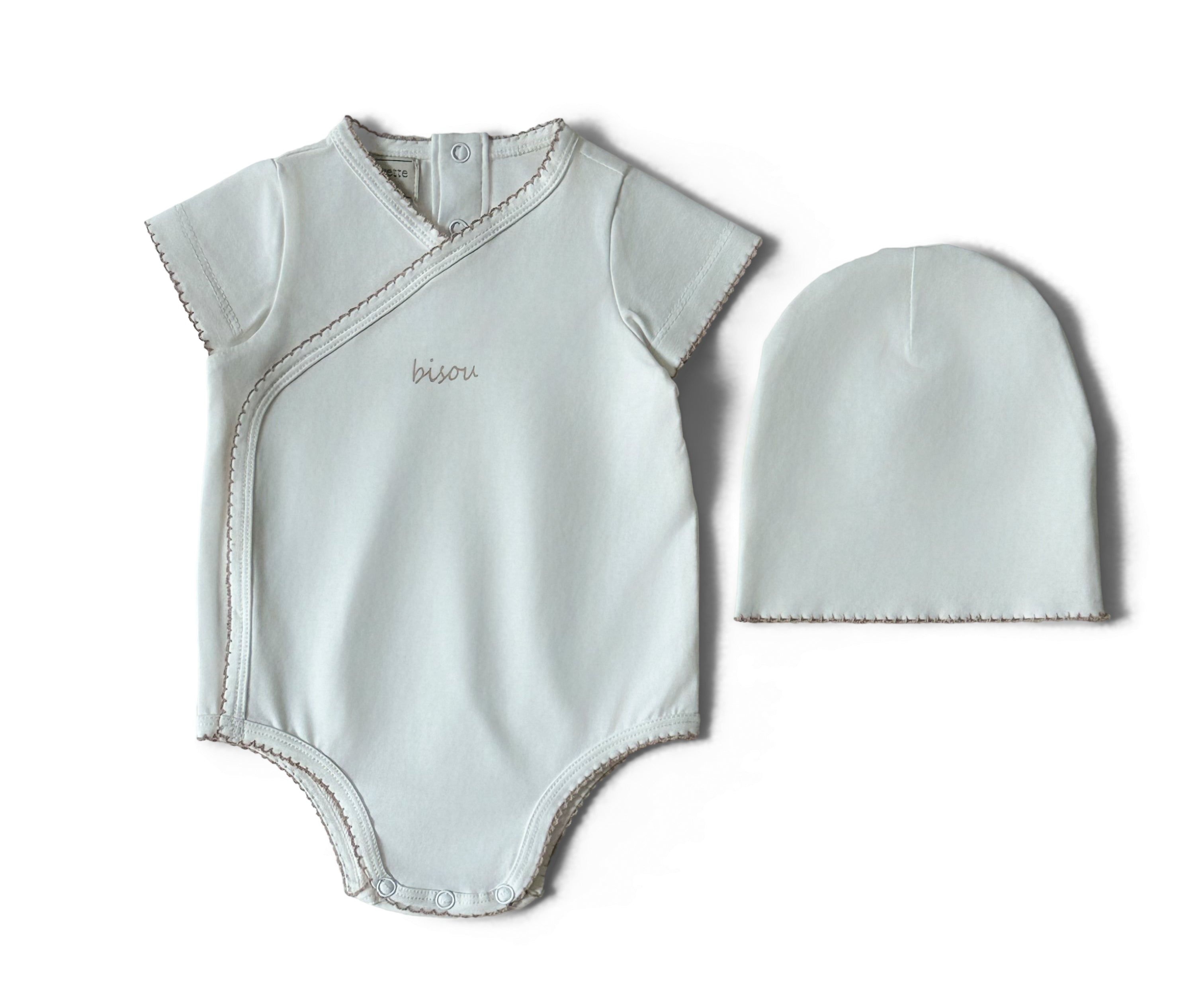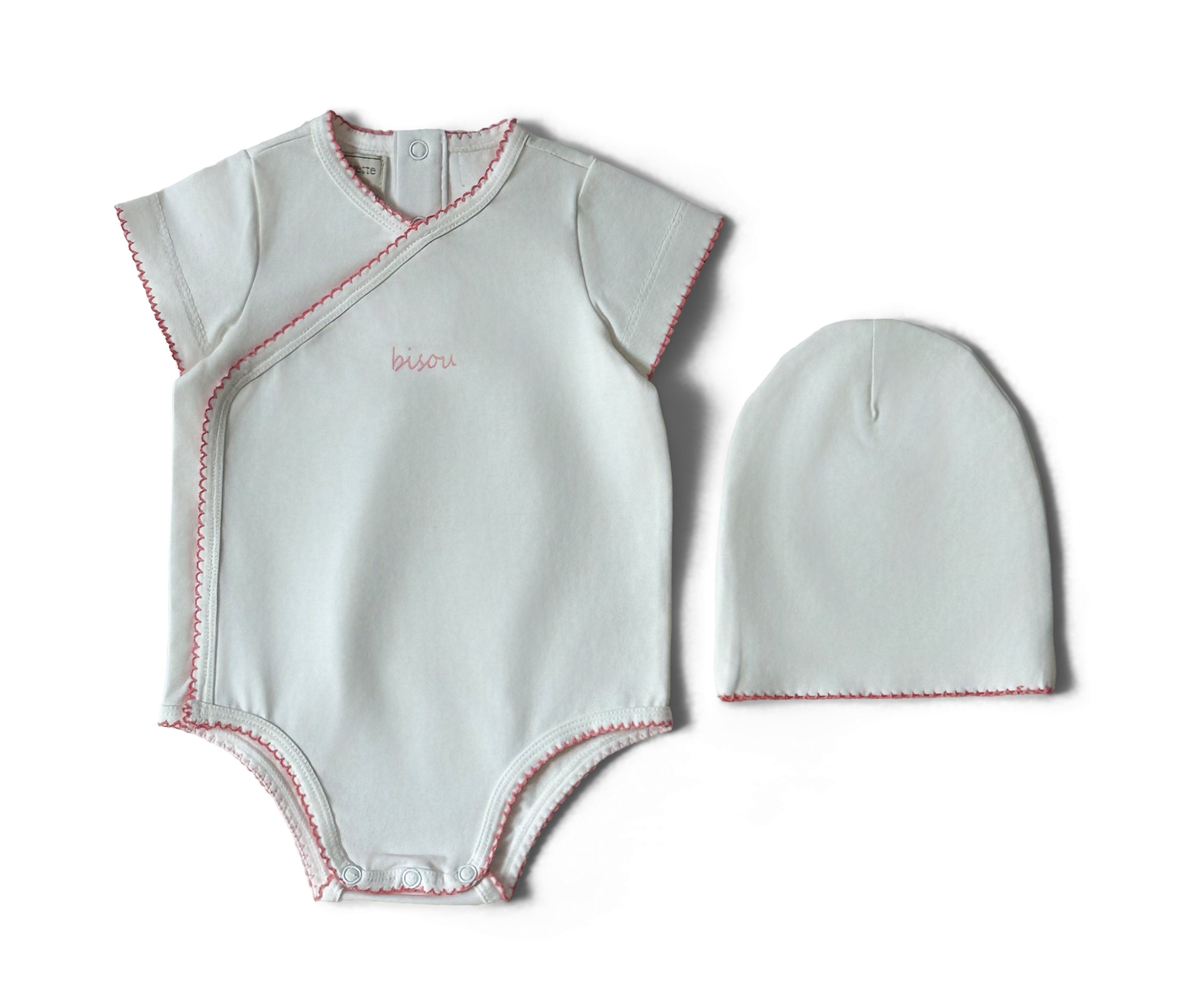 A soft cotton onesie with “Bisou” written in the center, finished with a trim around the entire piece. Comes in two colors and includes a matching snug hat.