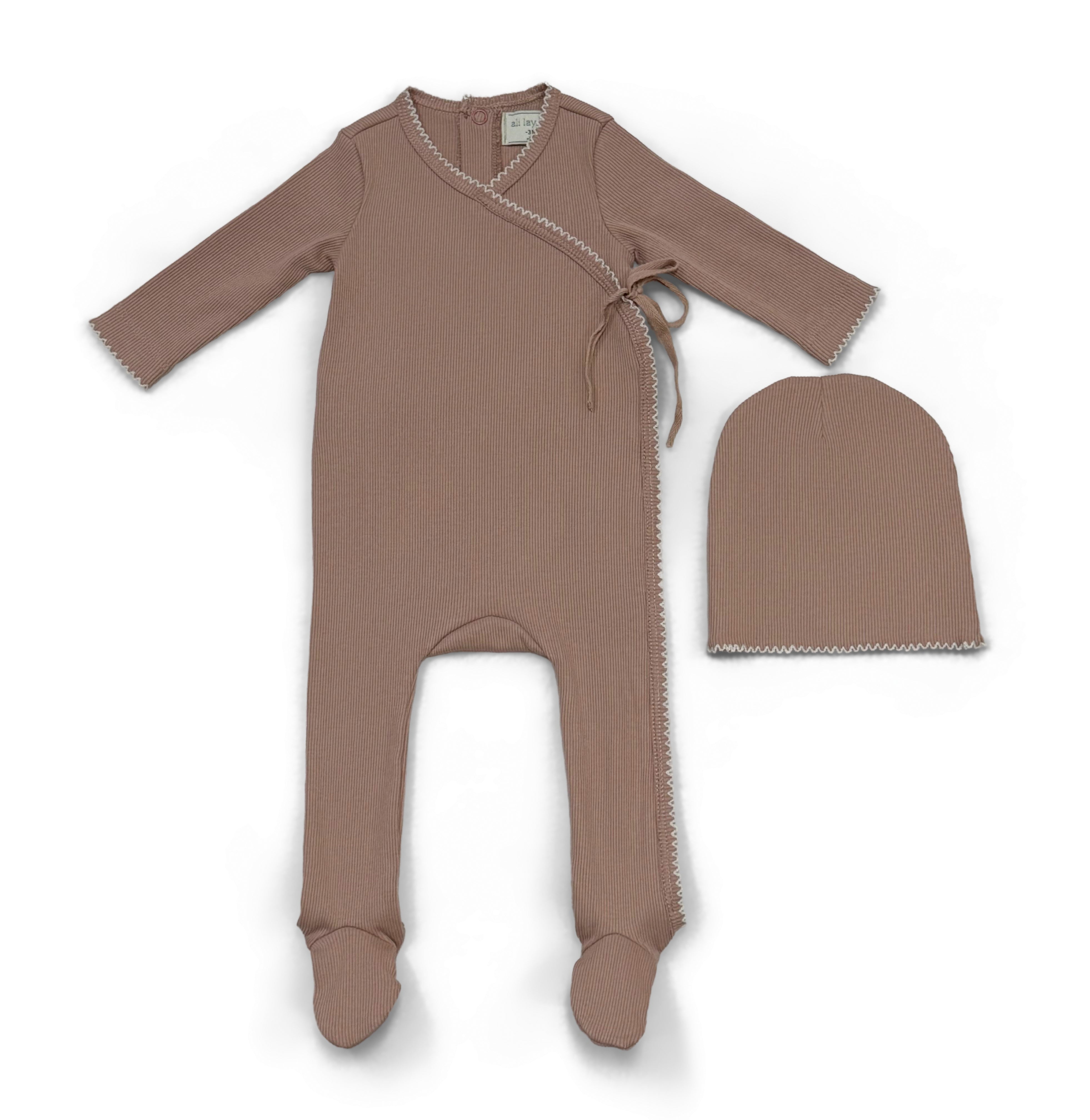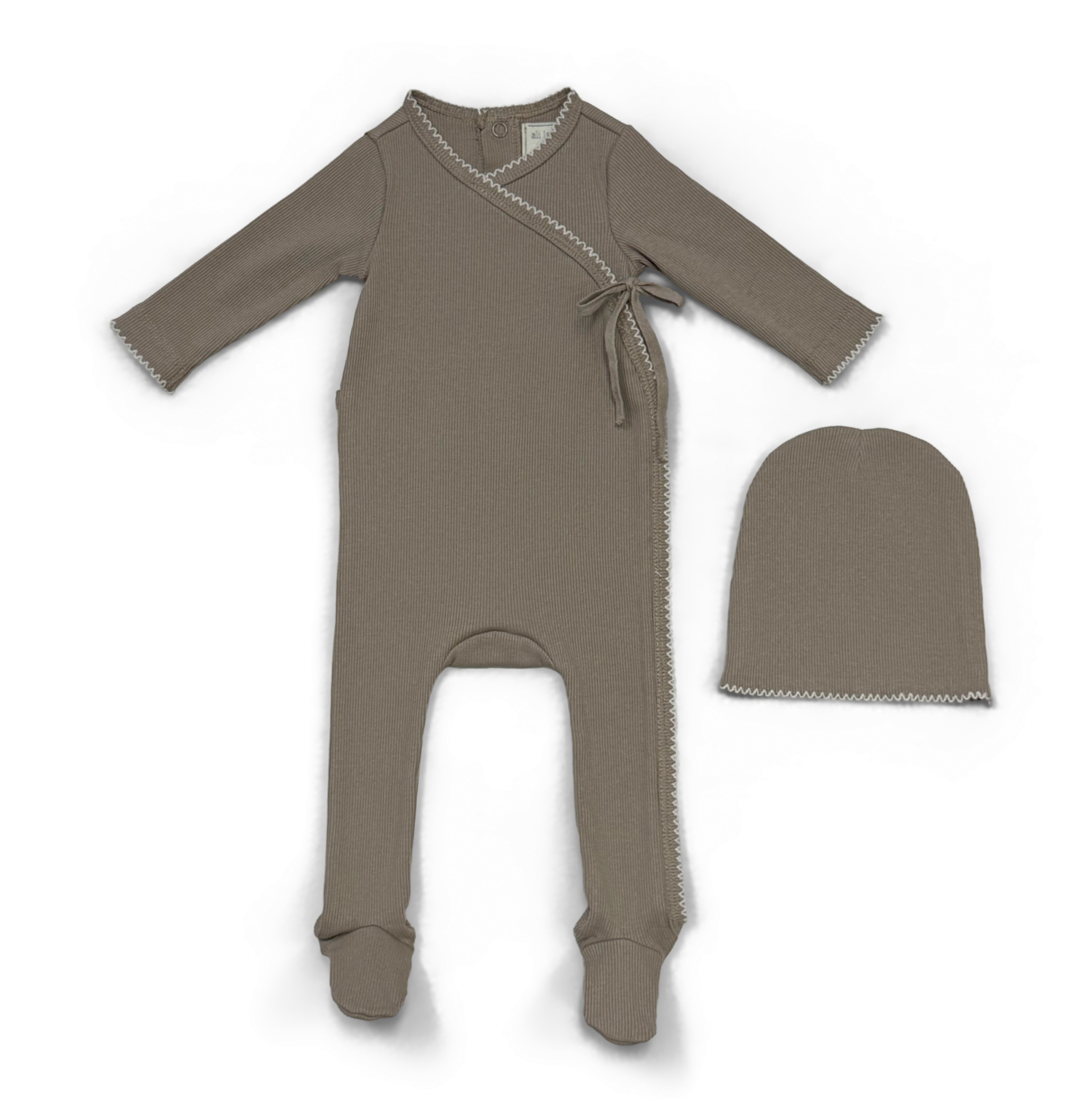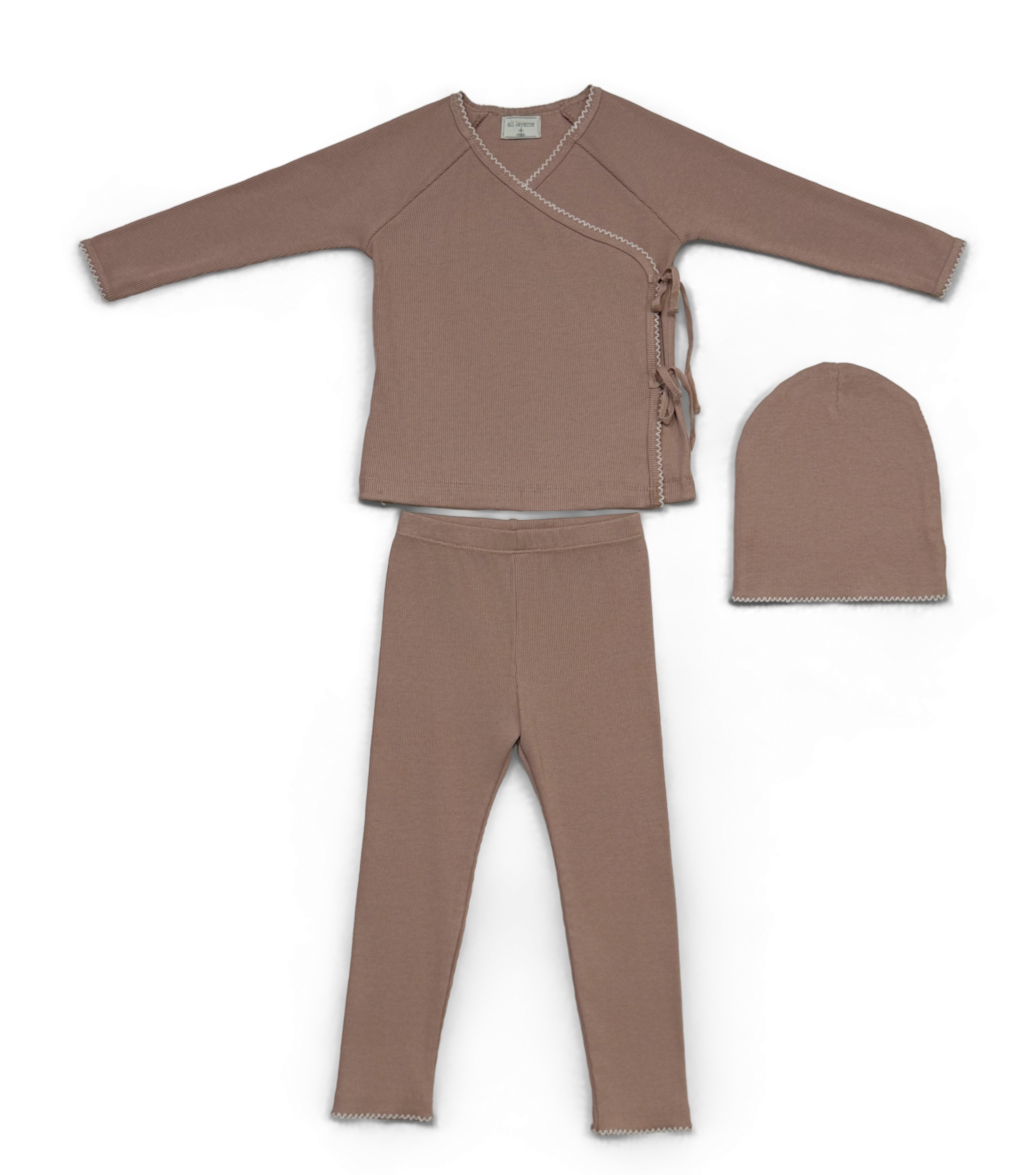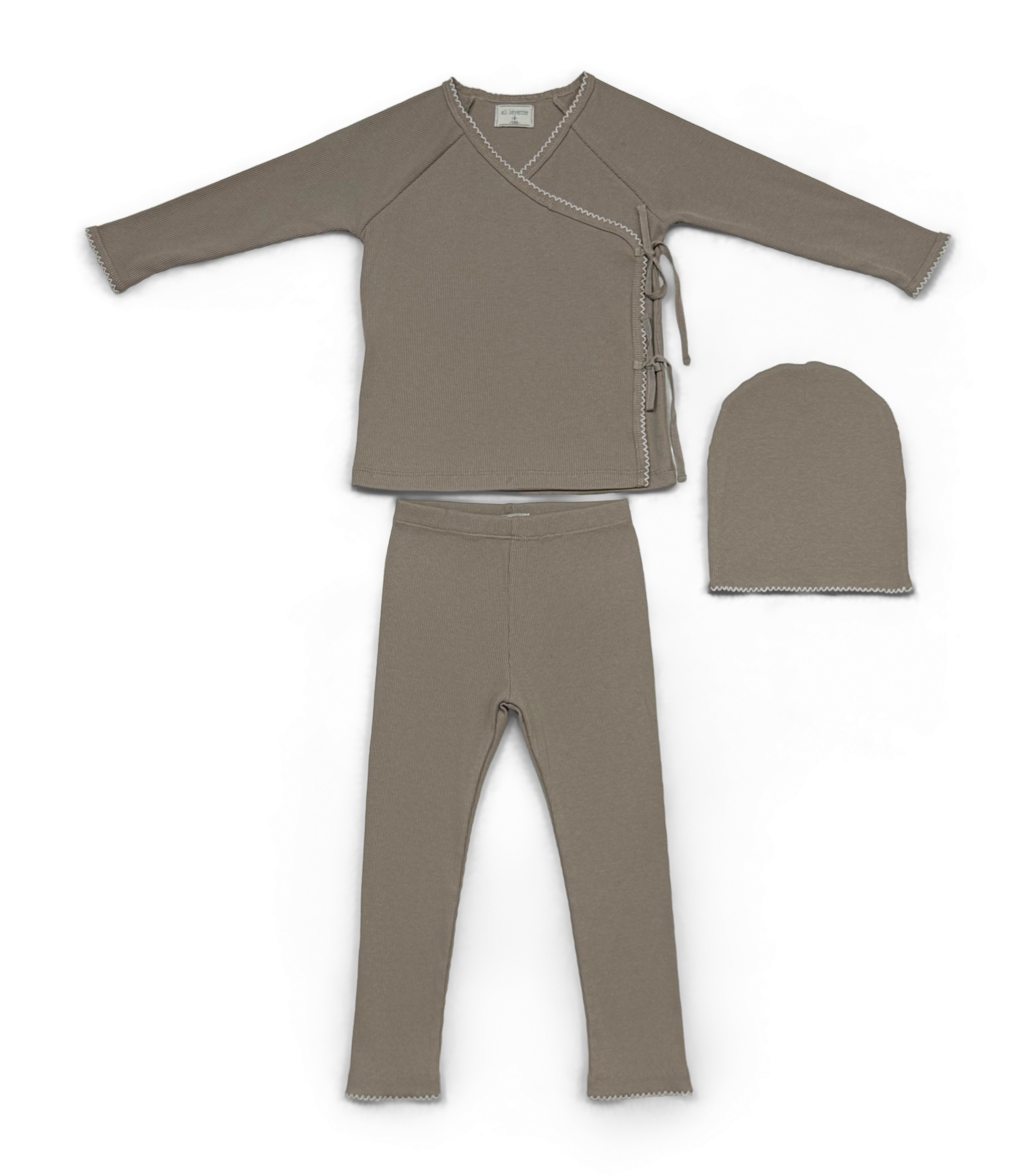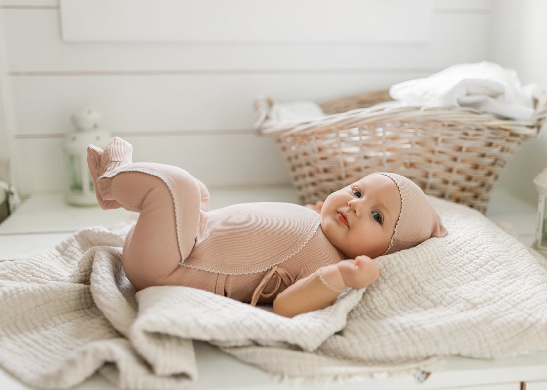 Ribbed stretch layette in pink, gray, and taupe with side bow.
