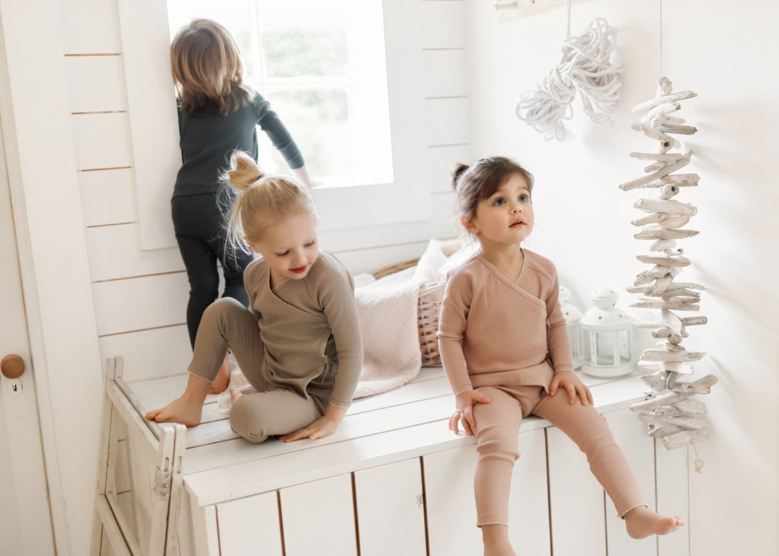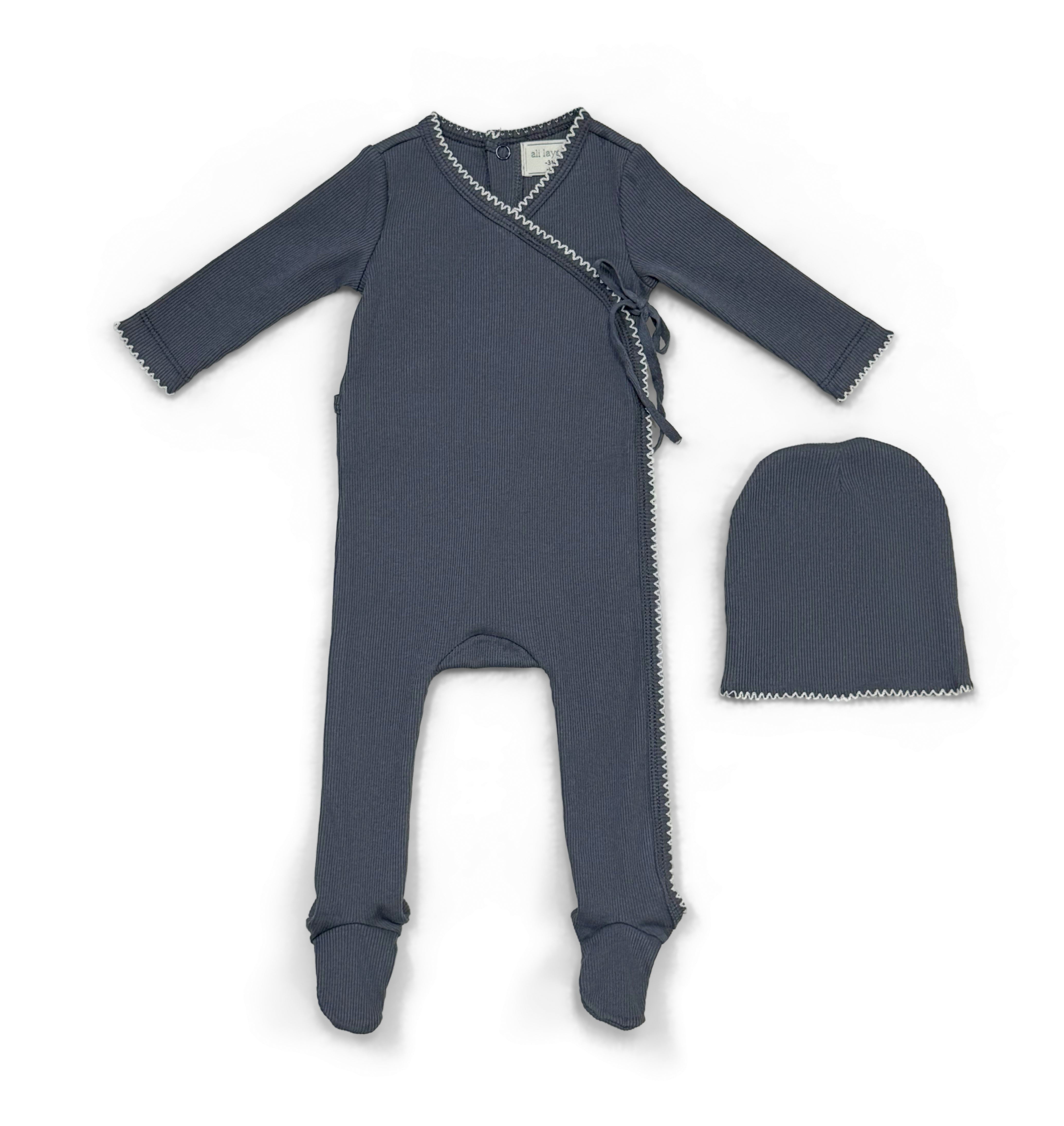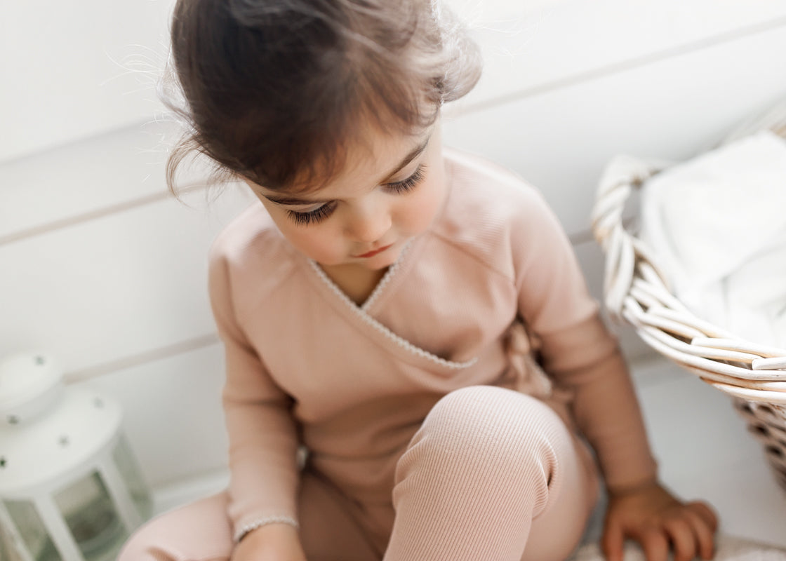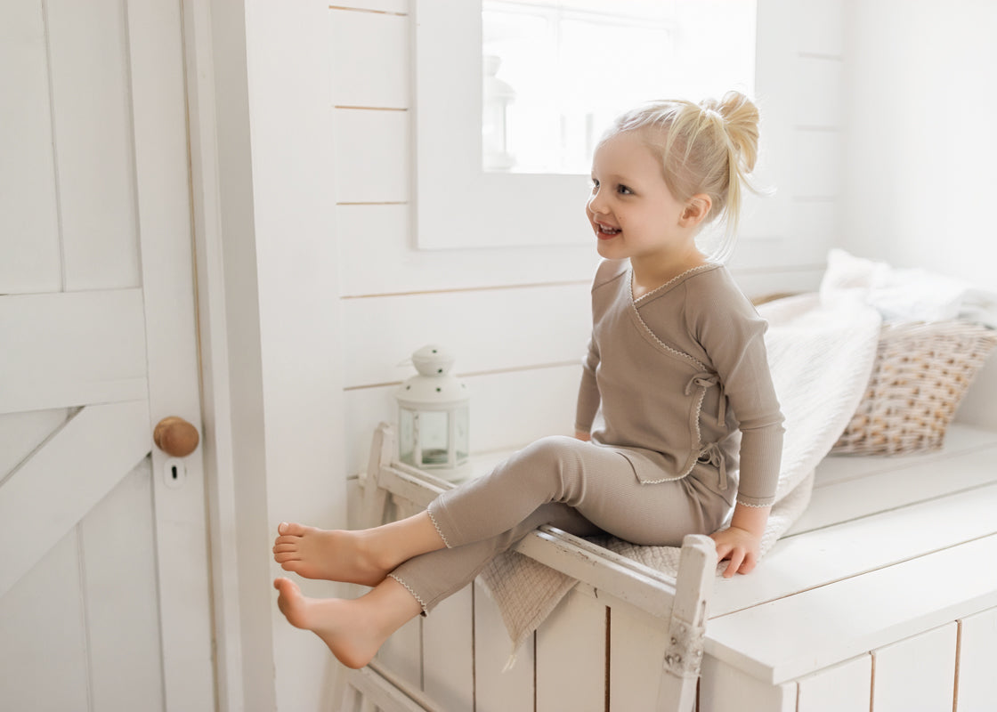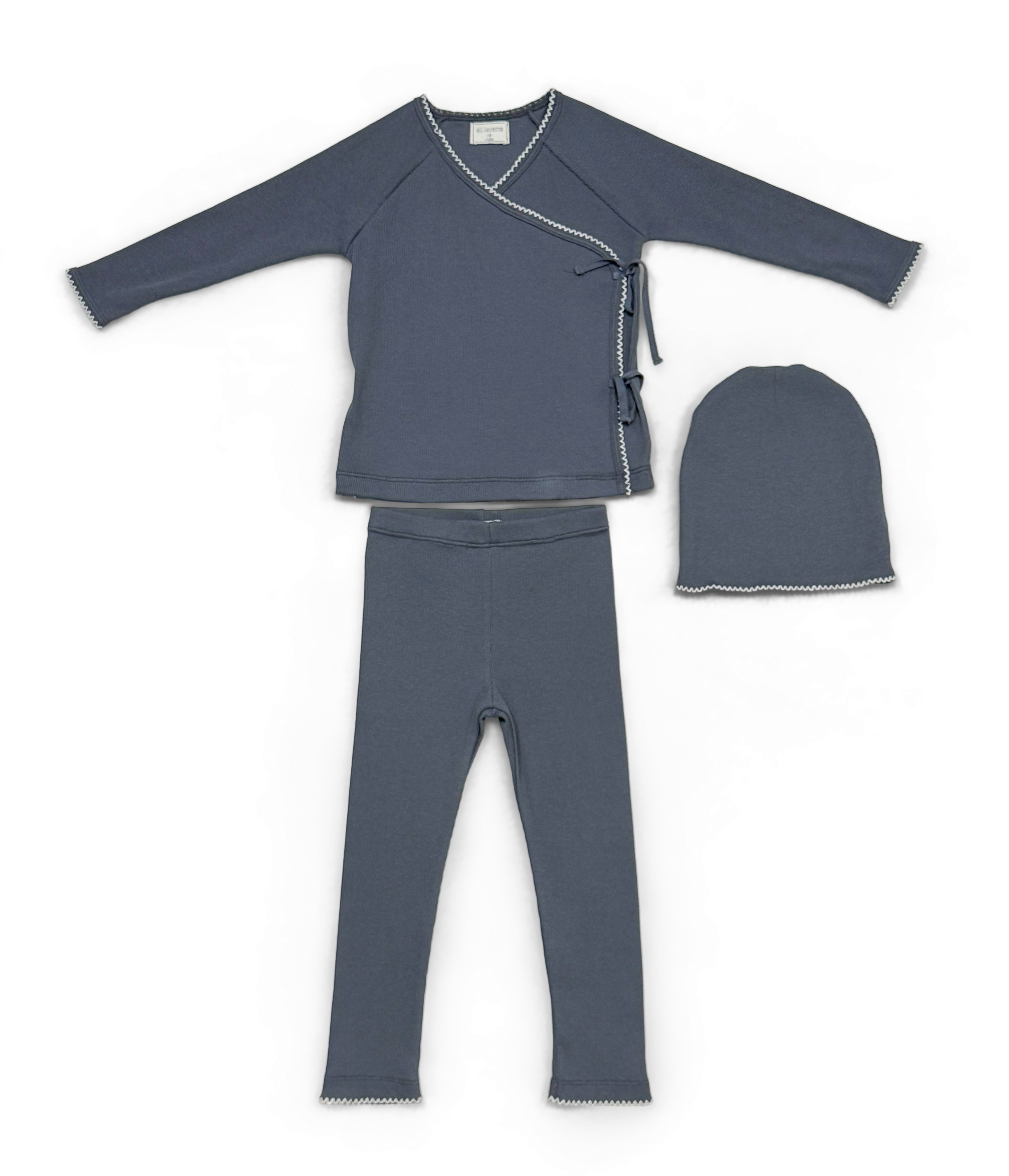 Ribbed stretch layette in pink, gray, and taupe with side bow.